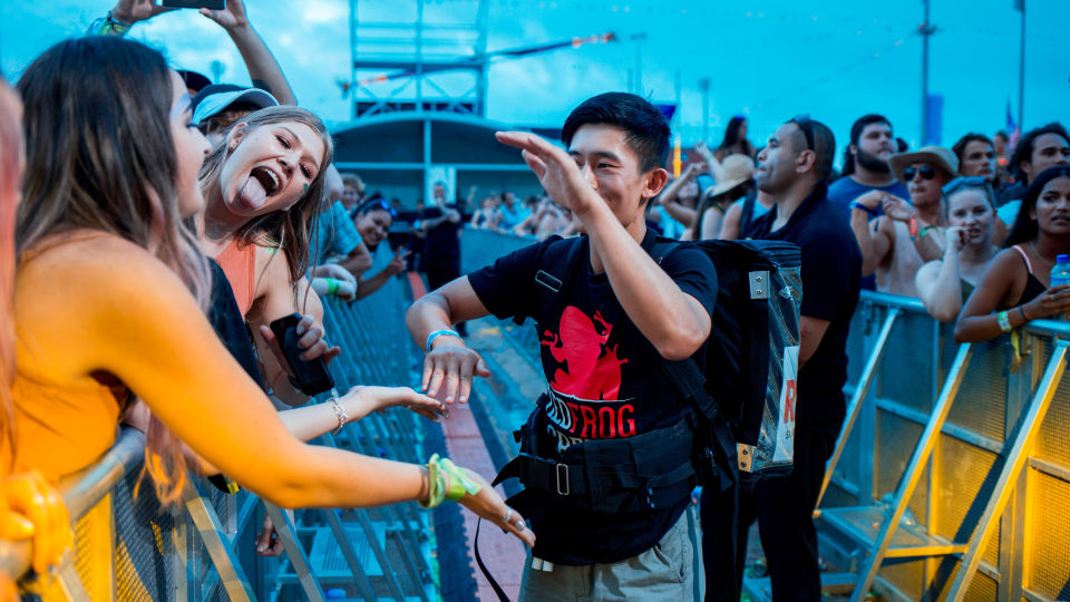 Handing out water in the pit of the stage, roaming with water backpacks and at hydration stations.