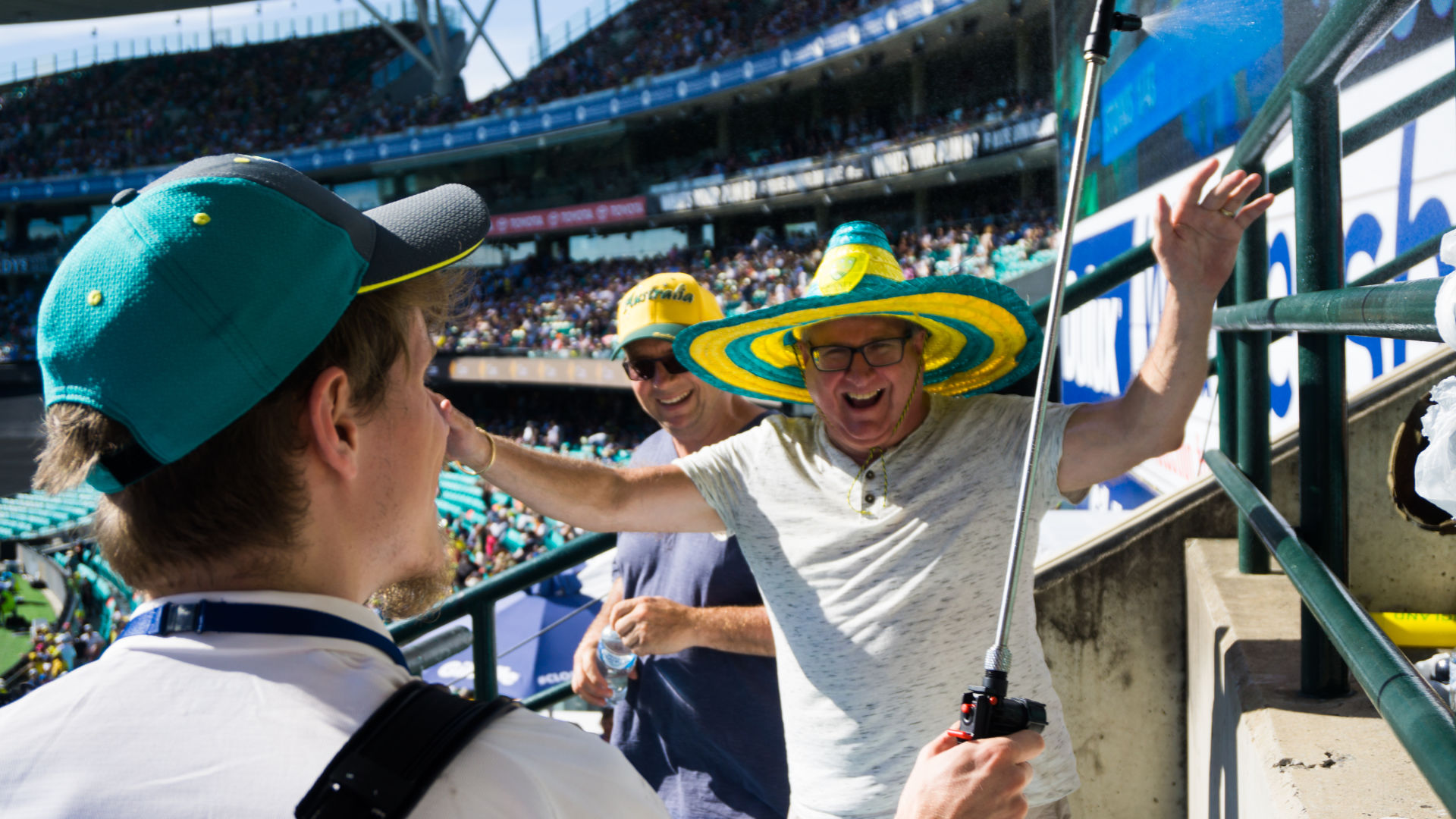 The Frog crew provide direct relief and support to fans at prominent sports events by distributing red frog lollies, water, icy poles, sunscreen and high fives - keeping the crowds hydrated and happy on long game days.
